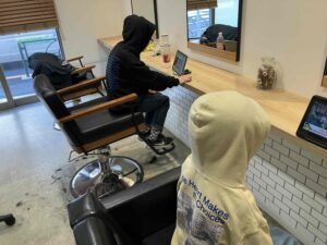 せっかくかっこよくしたのに、なぜかカット直後に2人共パーカーのフードをかぶってます。